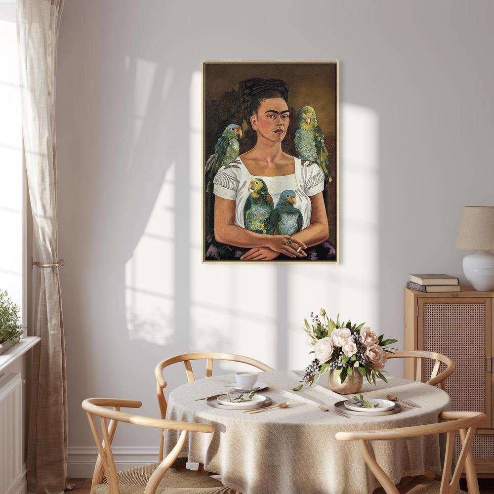 Niepowtarzalne obrazy z estetycznymi motywami są idealnym dopełnieniem eleganckiej aranżacji. Przy odrobinie kreatywności można je z łatwością dopasować do wnętrza urządzonego w każdym stylu. Obraz na płótnie „Obraz – Frida Kahlo – Ja i moje papugi” to unikalny element dekoracyjny który jest niemal uniwersalny. Przypadnie do gustu każdemu, kto poszukuje oryginalnych ozdób, aby dopełnić swoją aranżację. Umieść go w swoim wnętrzu, a przekonasz się, że jest już kompletne i nie potrzebujesz już innych dodatków. Nie musisz się obawiać o jakość i wygląd swojej dekoracji. Dostępne w ofercie obrazy na płótnie wiernie odwzorowują detale. Odpowiednio dostosowana rozdzielczość druku gwarantuje intensywność kolorów oraz ostrość prezentowanego motywu. Tego typu produkty to doskonałe rozwiązanie, jeśli wciąż narzekasz na puste miejsce na ścianie i zastanawiasz się, jak je wypełnić. To stylowy element dekoracyjny, dzięki któremu wnętrze staje się wyjątkowo przytulne. Obrazy