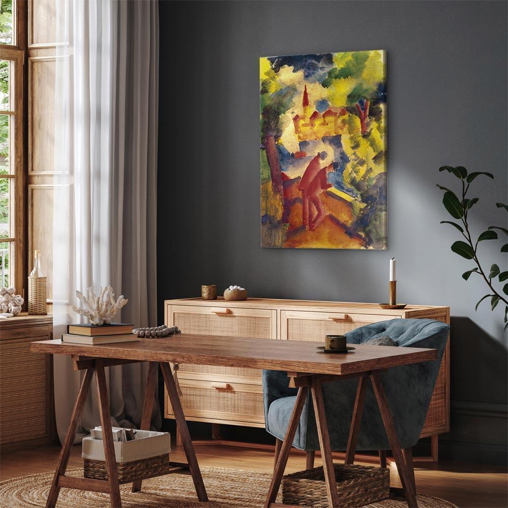 Niepowtarzalne obrazy z estetycznymi motywami są idealnym dopełnieniem eleganckiej aranżacji. Przy odrobinie kreatywności można je z łatwością dopasować do wnętrza urządzonego w każdym stylu. Obraz na płótnie „Obraz – August Macke – Mężczyźni na drodze nad jeziorem” to unikalny element dekoracyjny który jest niemal uniwersalny. Przypadnie do gustu każdemu, kto poszukuje oryginalnych ozdób, aby dopełnić swoją aranżację. Umieść go w swoim wnętrzu, a przekonasz się, że jest już kompletne i nie potrzebujesz już innych dodatków. Nie musisz się obawiać o jakość i wygląd swojej dekoracji. Dostępne w ofercie obrazy na płótnie wiernie odwzorowują detale. Odpowiednio dostosowana rozdzielczość druku gwarantuje intensywność kolorów oraz ostrość prezentowanego motywu. Tego typu produkty to doskonałe rozwiązanie, jeśli wciąż narzekasz na puste miejsce na ścianie i zastanawiasz się, jak je wypełnić. To stylowy element dekoracyjny, dzięki któremu wnętrze staje się wyjątkowo przytulne.