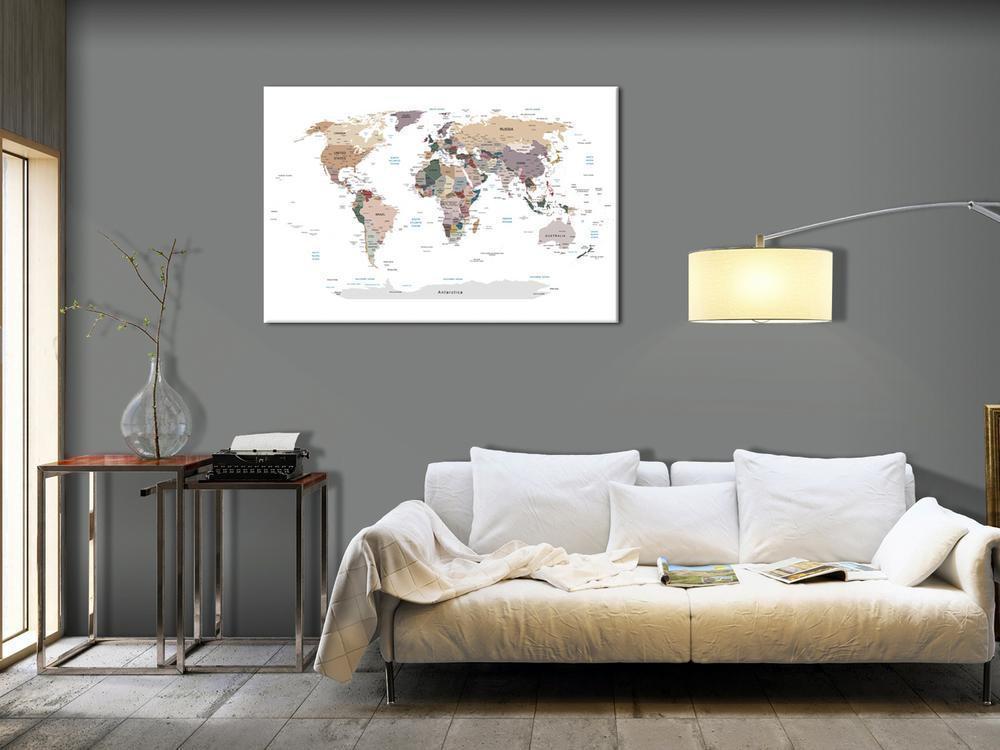 Obraz na korku „Obraz na korku – Dokąd dziś? [Mapa korkowa]” to produkt dla osób poszukujących oryginalnych ozdób na ścianę. Ekologiczny materiał i ciekawy wzór sprawiają, że zwykła tablica korkowa zmienia się w stylowy dodatek, który możesz wykorzystać w rozmaity sposób. Do obrazów na korku można przypinać pinezki, zaznaczać odwiedzone miejsca na mapie lub doczepiać notatki. Obraz na korku „Obraz na korku – Dokąd dziś? [Mapa korkowa]” jest o wiele lżejszy od tradycyjnych dekoracji ściennych. Dzięki temu ozdobne tablice korkowe mogą zawisnąć w dowolnym miejscu w Twoim mieszkaniu bądź biurze. Płótno z wydrukiem nakładane jest na płytę korkową. Dzięki temu nadruk cechuje się wyrazistymi kolorami i oddaje najdrobniejsze detale. Przypnij do niego pinezki lub notatki i stwórz swój indywidualny wzór na swojej ścianie!