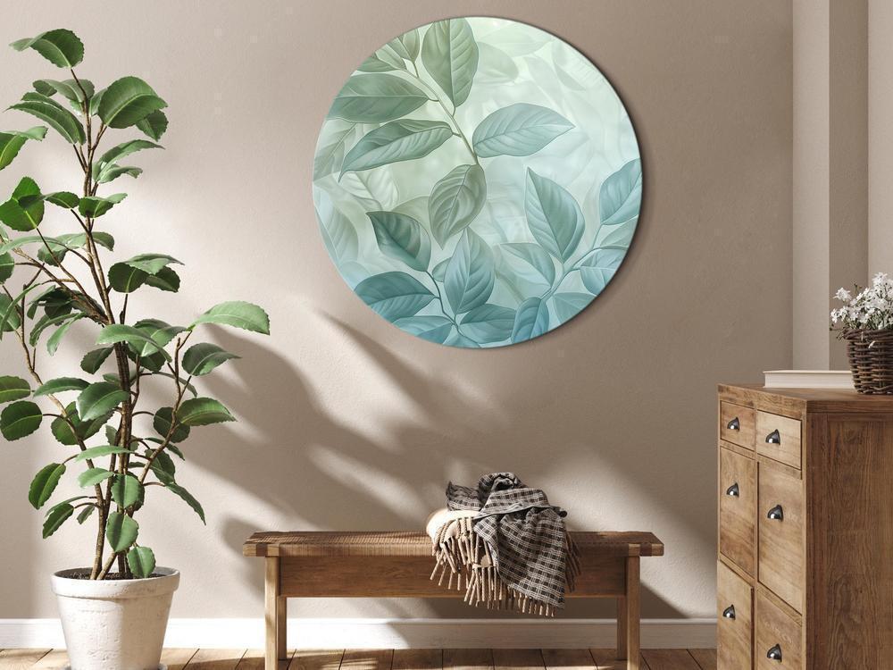 Obraz okrągły - Duże liście w odcieniach zielono-miętowych: motyw botanicznyObraz okrągły – Duże liście w odcieniach zielono-miętowych: motyw botaniczny