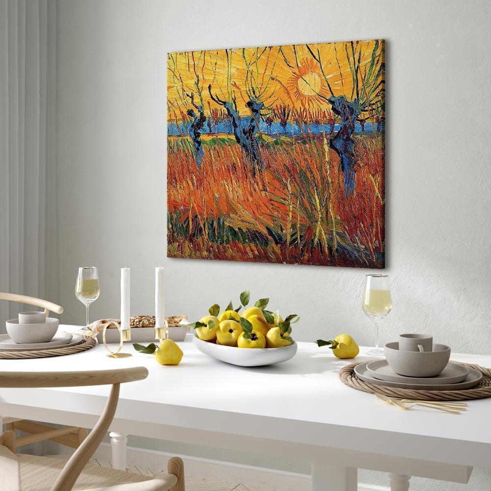 Niepowtarzalne obrazy z estetycznymi motywami są idealnym dopełnieniem eleganckiej aranżacji. Przy odrobinie kreatywności można je z łatwością dopasować do wnętrza urządzonego w każdym stylu. Obraz na płótnie „Obraz – Vincent van Gogh – Wierzby o zachodzie słońca” to unikalny element dekoracyjny który jest niemal uniwersalny. Przypadnie do gustu każdemu, kto poszukuje oryginalnych ozdób, aby dopełnić swoją aranżację. Umieść go w swoim wnętrzu, a przekonasz się, że jest już kompletne i nie potrzebujesz już innych dodatków. Nie musisz się obawiać o jakość i wygląd swojej dekoracji. Dostępne w ofercie obrazy na płótnie wiernie odwzorowują detale. Odpowiednio dostosowana rozdzielczość druku gwarantuje intensywność kolorów oraz ostrość prezentowanego motywu. Tego typu produkty to doskonałe rozwiązanie, jeśli wciąż narzekasz na puste miejsce na ścianie i zastanawiasz się, jak je wypełnić. To stylowy element dekoracyjny, dzięki któremu wnętrze staje się wyjątkowo przytulne.