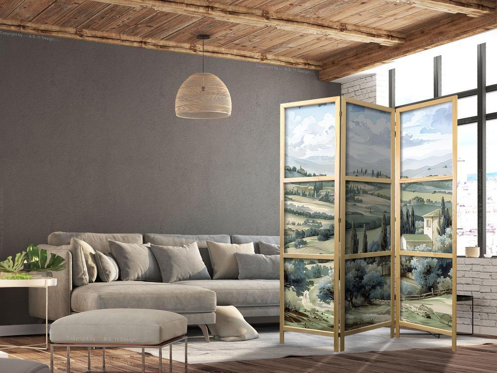 Parawan japoński - Pejzaż z zielonymi polami i drzewami - toskański słoneczny widokParawan japoński – Pejzaż z zielonymi polami i drzewami – toskański słoneczny widok