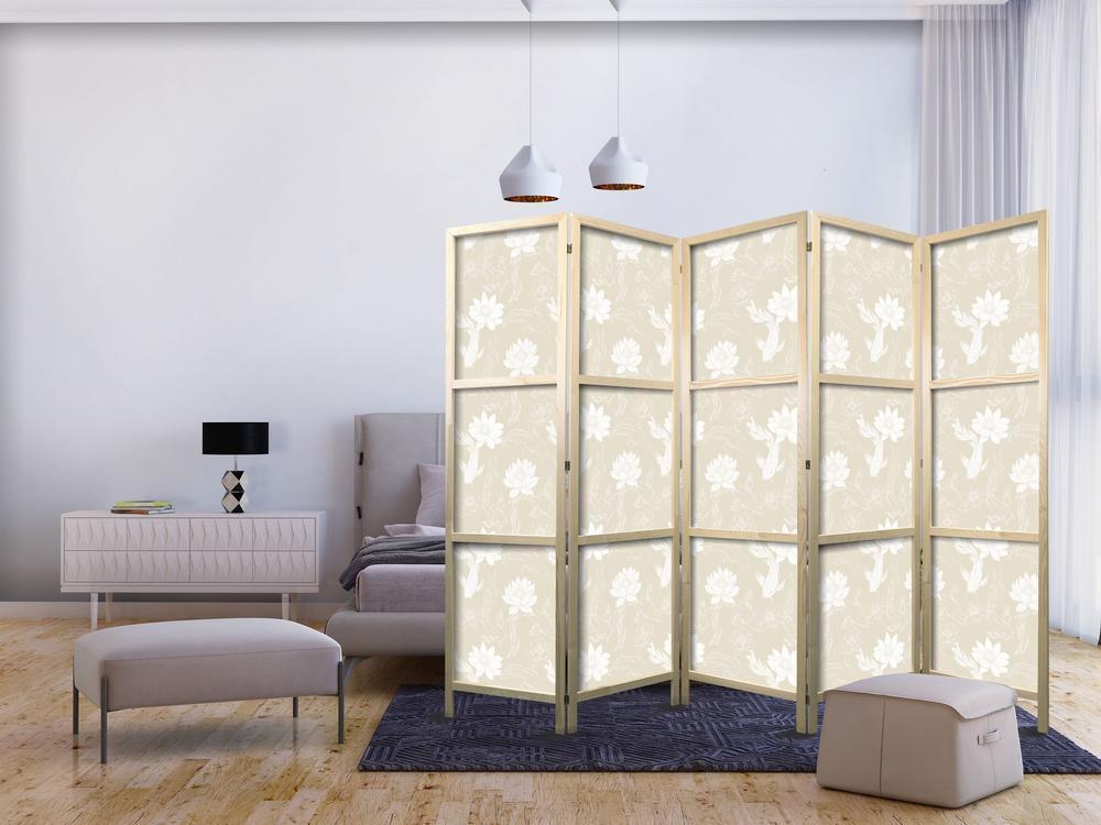 Parawan japoński - Ryby i lilie wodne - Jasne orientalne ryby pływające pośród kwiatów wodnych na delikatnym piaskowo-beżowym tleParawan japoński – Ryby i lilie wodne – Jasne orientalne ryby pływające pośród kwiatów wodnych na delikatnym piaskowo-beżowym tle