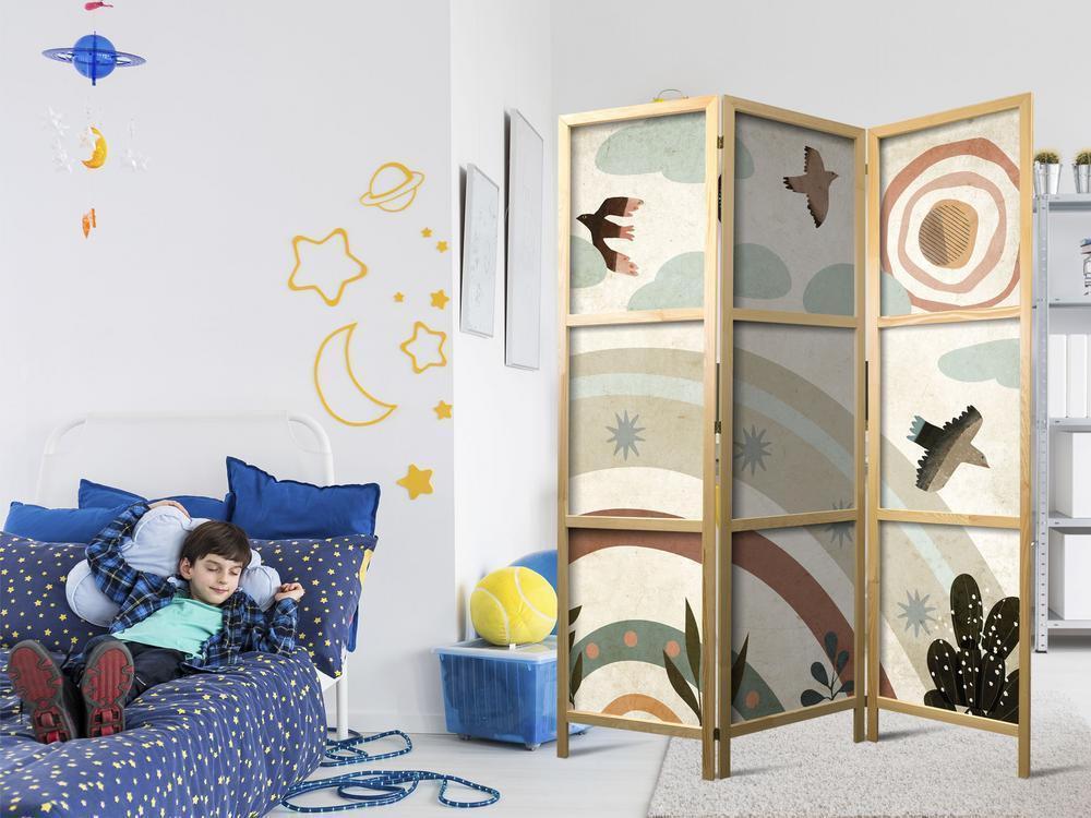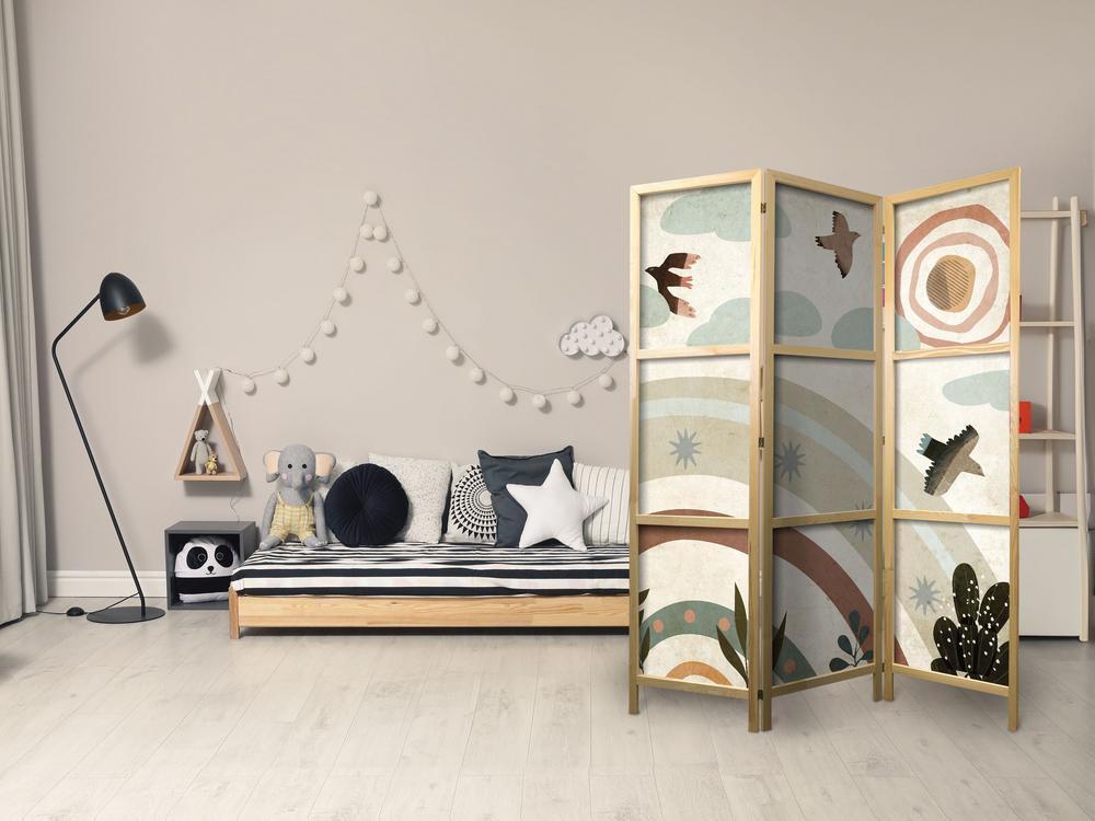Parawan japoński - Słońce ponad tęczą - Ptaki w stonowanej kolorystyce - latające wśród chmur ponad tęczą i roślinnością na jasno-beżowym tleParawan japoński – Słońce ponad tęczą – Ptaki w stonowanej kolorystyce – latające wśród chmur ponad tęczą i roślinnością na jasno-beżowym tle