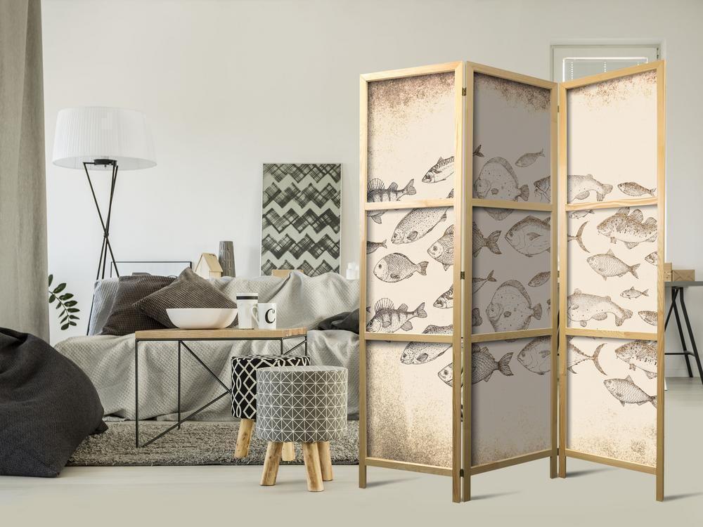 Stylowy i lekki, japoński parawan doskonale nadaje się do podziału pomieszczenia na kilka stref. Dzięki niemu możliwe staje się wyznaczenie części do pracy i oddzielenie jej od części służącej do wypoczynku, bez potrzeby wprowadzania dużych zmian we wnętrzu. Parawan nie zaburza dotychczasowego ładu i nie powoduje chaosu. Wprost przeciwnie, jest dobrym uzupełnieniem aranżacji. Parawan w stylu japońskim to sprawdzony wybór nie tylko do domu lub mieszkania. Coraz częściej znajduje zastosowanie w miejscach użytku publicznego, takich jak salon fryzjerski bądź kosmetyczny, butik, hotel czy gabinet lekarski. Rozłożenie go jest dobrym sposobem na zapewnienie dyskrecji. Utrzymany w japońskim stylu parawan „Parawan japoński – Szkic ławicy ryb – Szkice różnych gatunków ryb płynących w ławicy na beżowym tle w stylu vintage” wprowadza do wnętrza orientalny klimat, dlatego pomaga w stworzeniu oryginalnej aranżacji. To praktyczny element dekoracyjny, który ma ponadczasowy charakter, a więc nie wyjdzie z mody. Polecamy go każdemu, kto chce stworzyć przytulne i stylowe wnętrze.