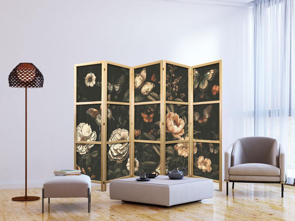 Parawan japoński - Tajemniczy ogród - motyle latające nad kwiatami - rustykalny wieczórParawan japoński – Tajemniczy ogród – motyle latające nad kwiatami – rustykalny wieczór