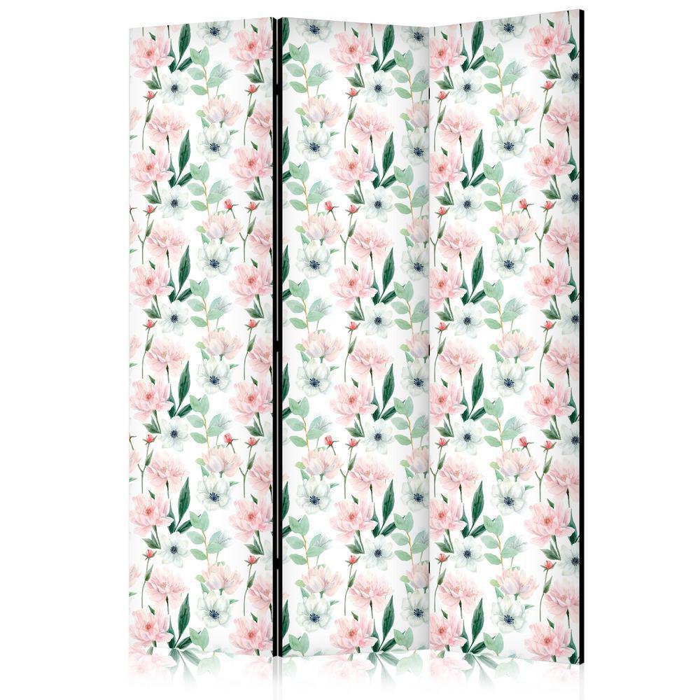 Parawan – Piwonie – różowe i białe kwiaty i zielone listki na białym tle